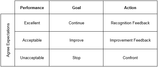 Using this model, feedback can be segmented into three broad categories that correspond with three levels of performance: excellent, acceptable and unacceptable.